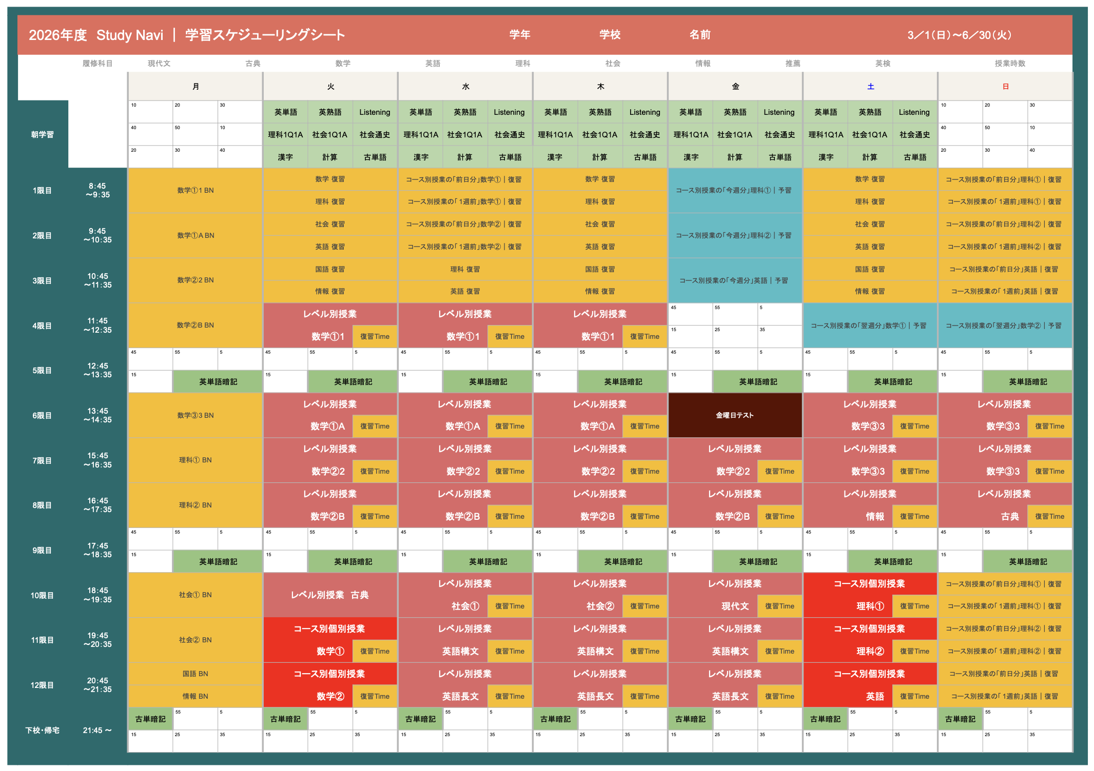 朝学習から夜の復習まで、1日を細かく設計した学習スケジュールで進めます。